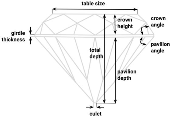 The graphic below explains the major parts of a diamond. When considering diamond anatomy, the three most important components are diameter, table, and depth. This is because the ratio of the table to the diameter, and the depth to diameter, figure prominently into determining a diamond's cut grade.